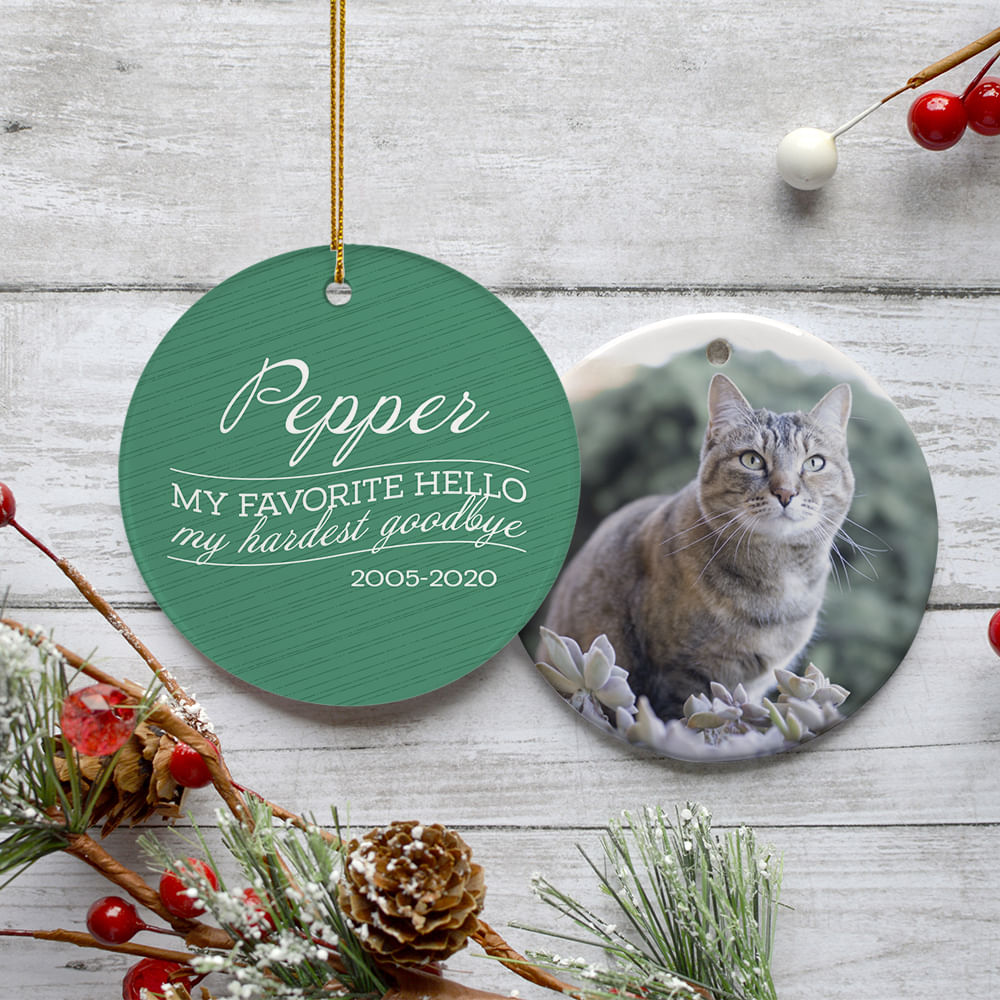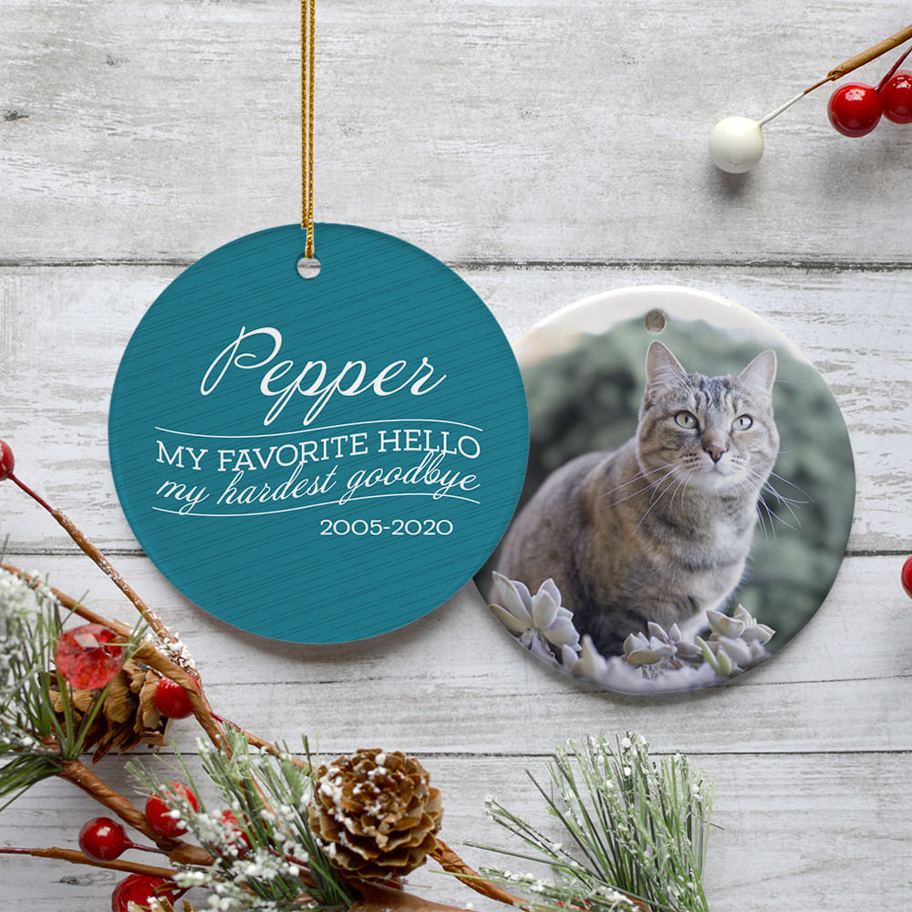 My Favorite Hello, Hardest Goodbye Cat Memorial Personalized Ceramic Round Ornament