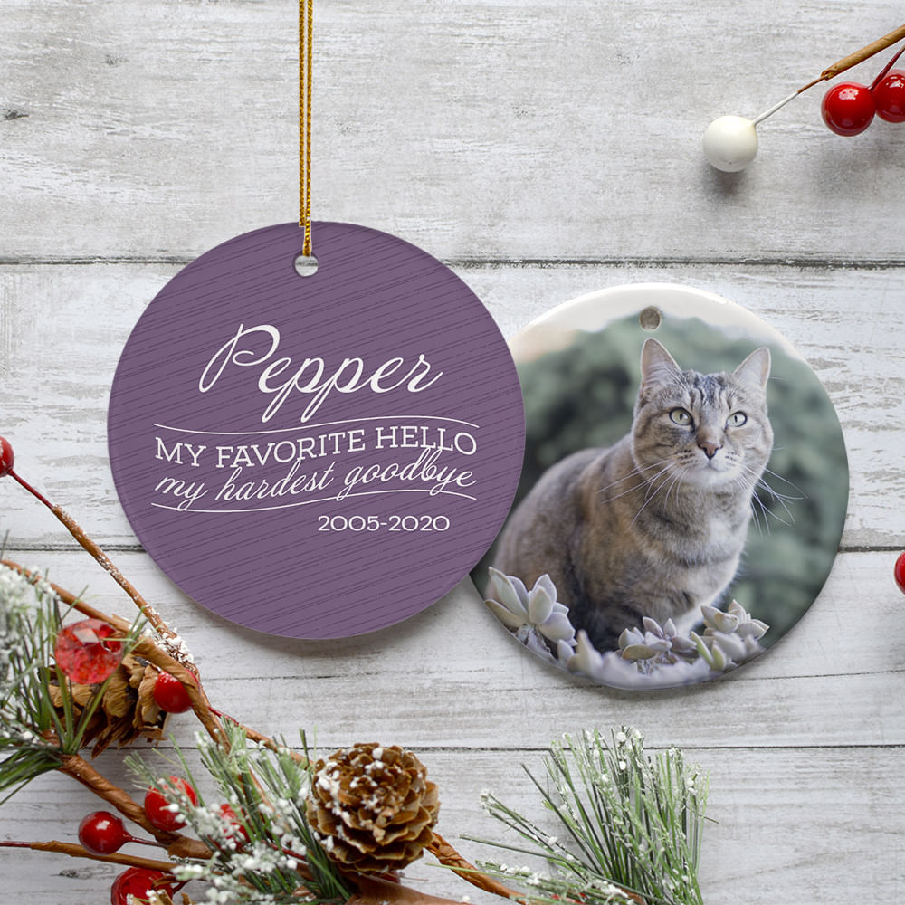 for My Favorite Hello, Hardest Goodbye Cat Memorial Personalized Ceramic Round Ornament