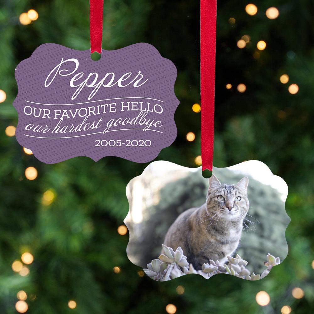 Our Favorite Hello, Our Hardest Goodbye Cat Memorial Personalized Metal Ornament