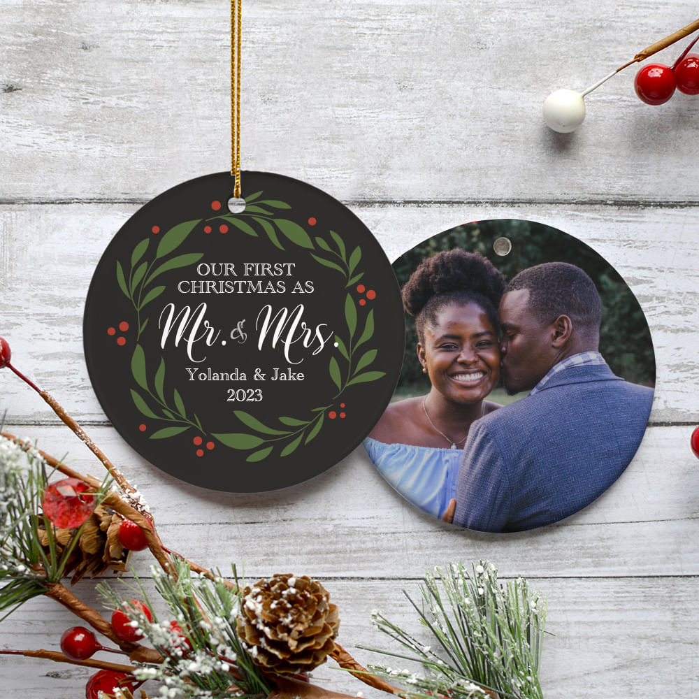 Our First as Mr and Mrs Wedding Personalized Ceramic Round Ornament