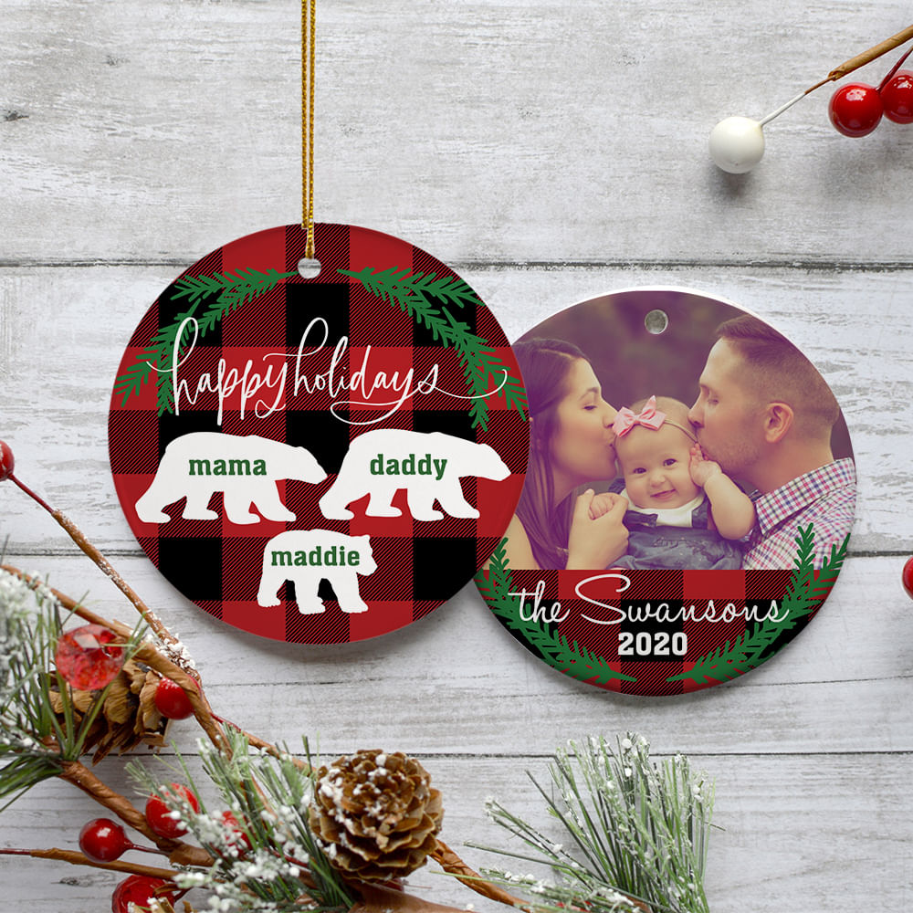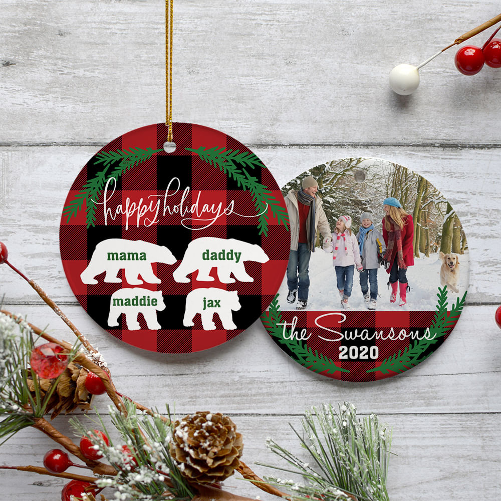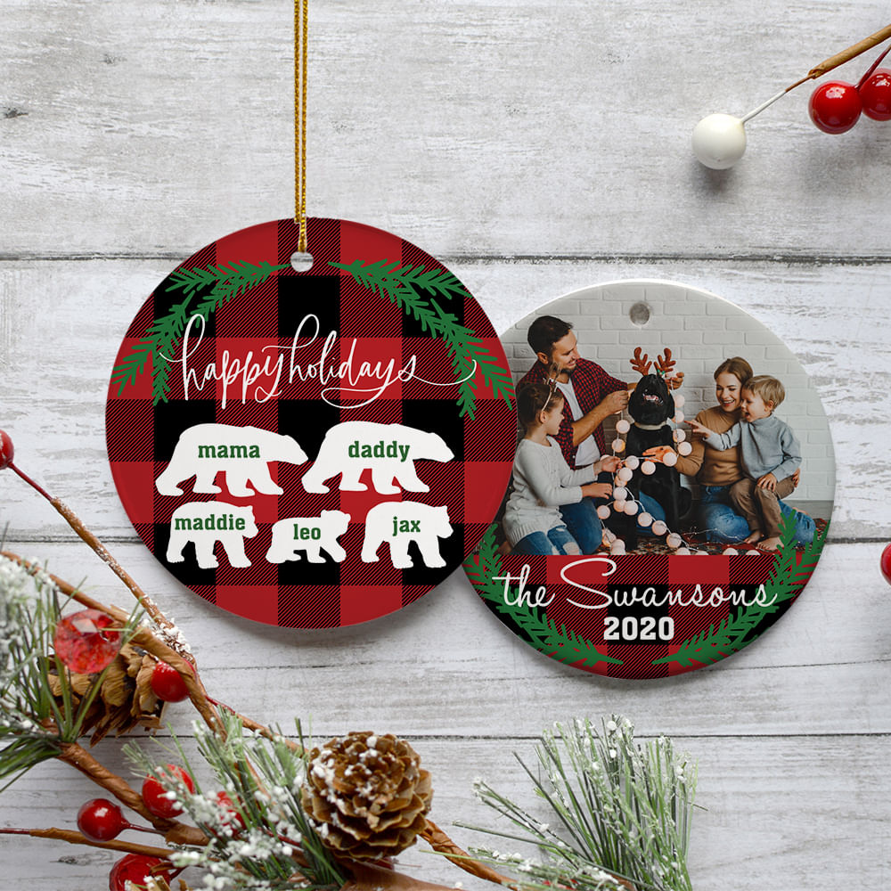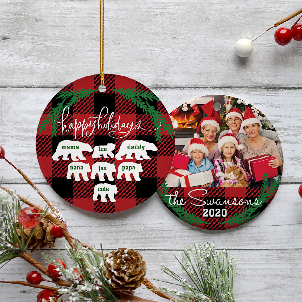Plaid Bear Family Personalized Ceramic Round Ornament - 3, 4, 5, 6 or 7 Family Members