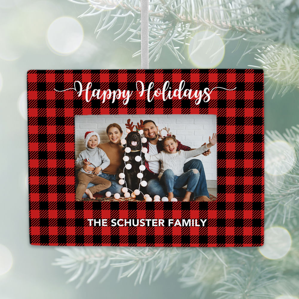 Plaid Happy Holidays Family Personalized Photo Frame Ornament