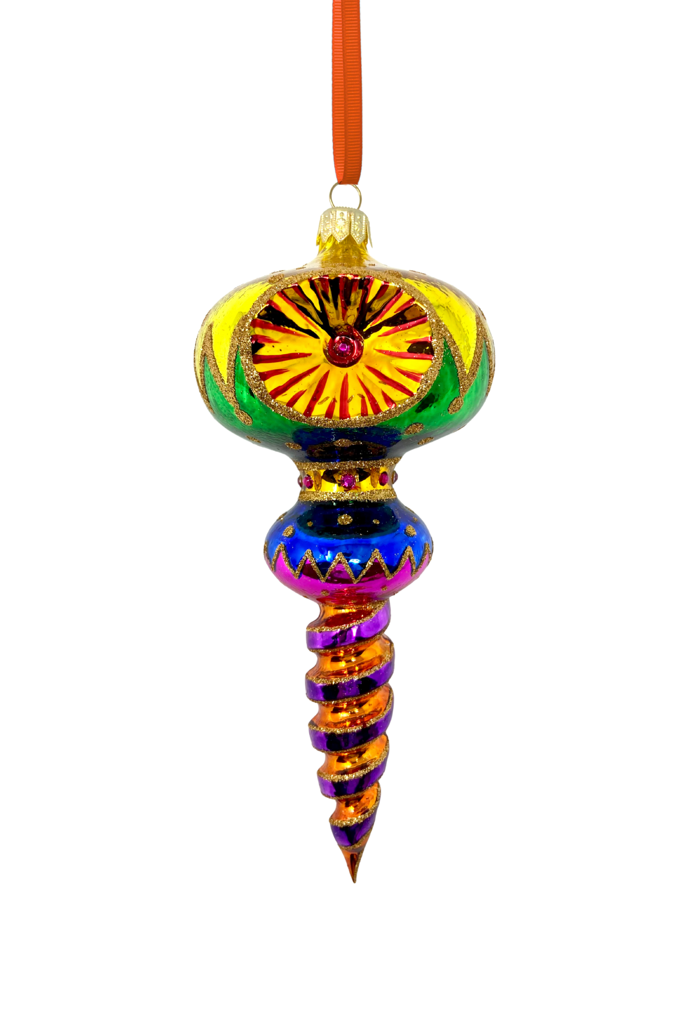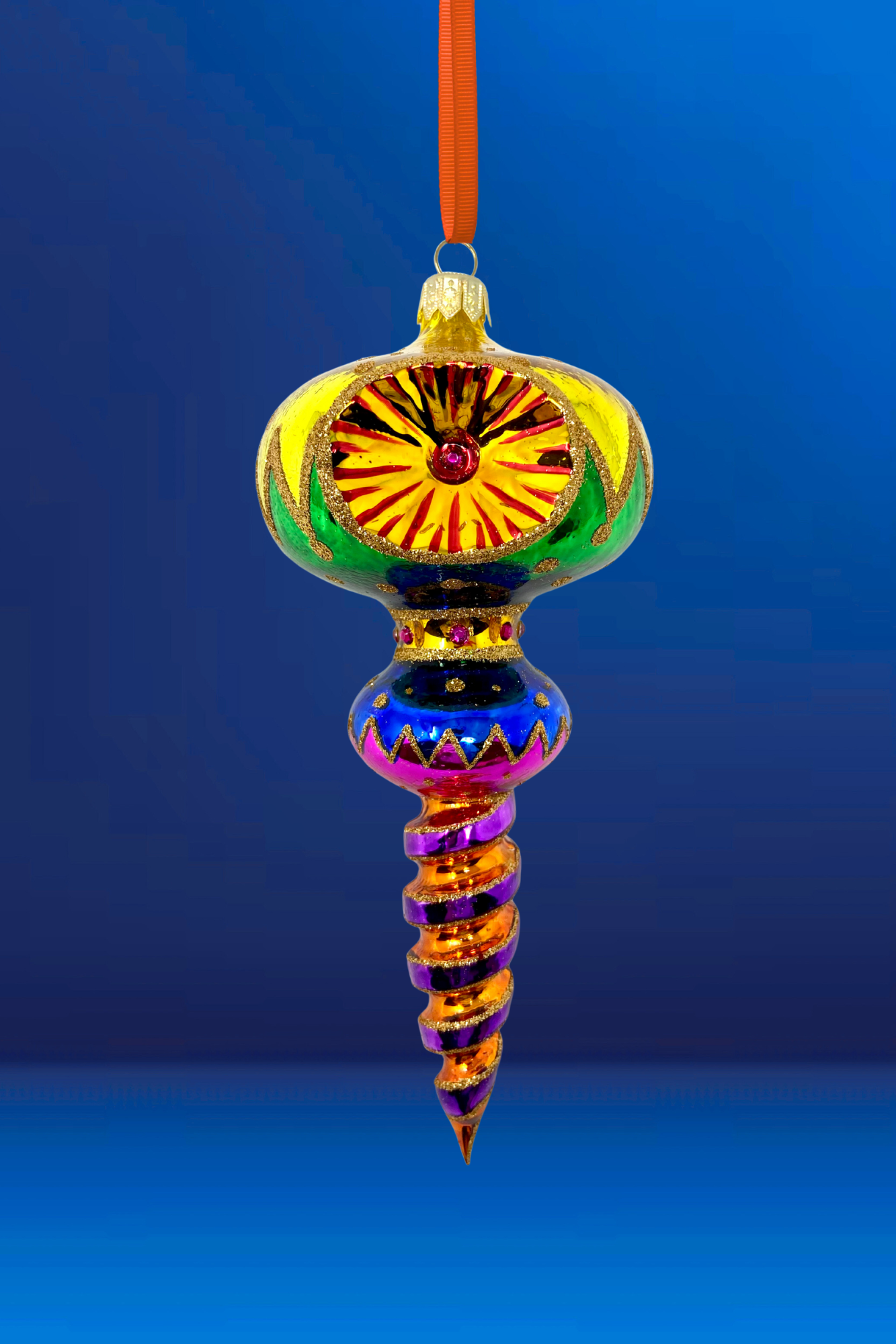With colors that rival the jungle at sunrise, this twisted finial bursts with carnival joy and tropical flair. Like a samba for your tree.