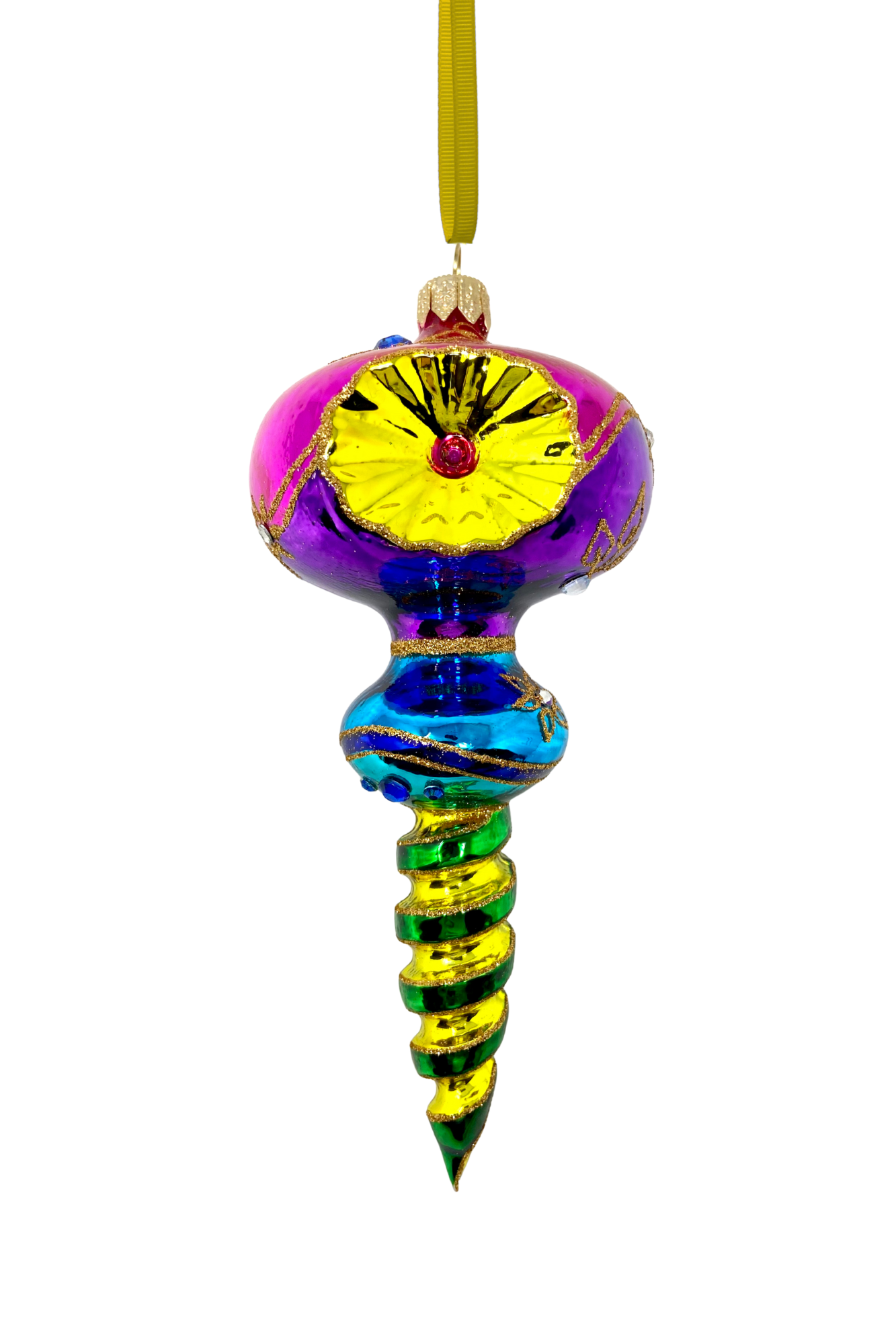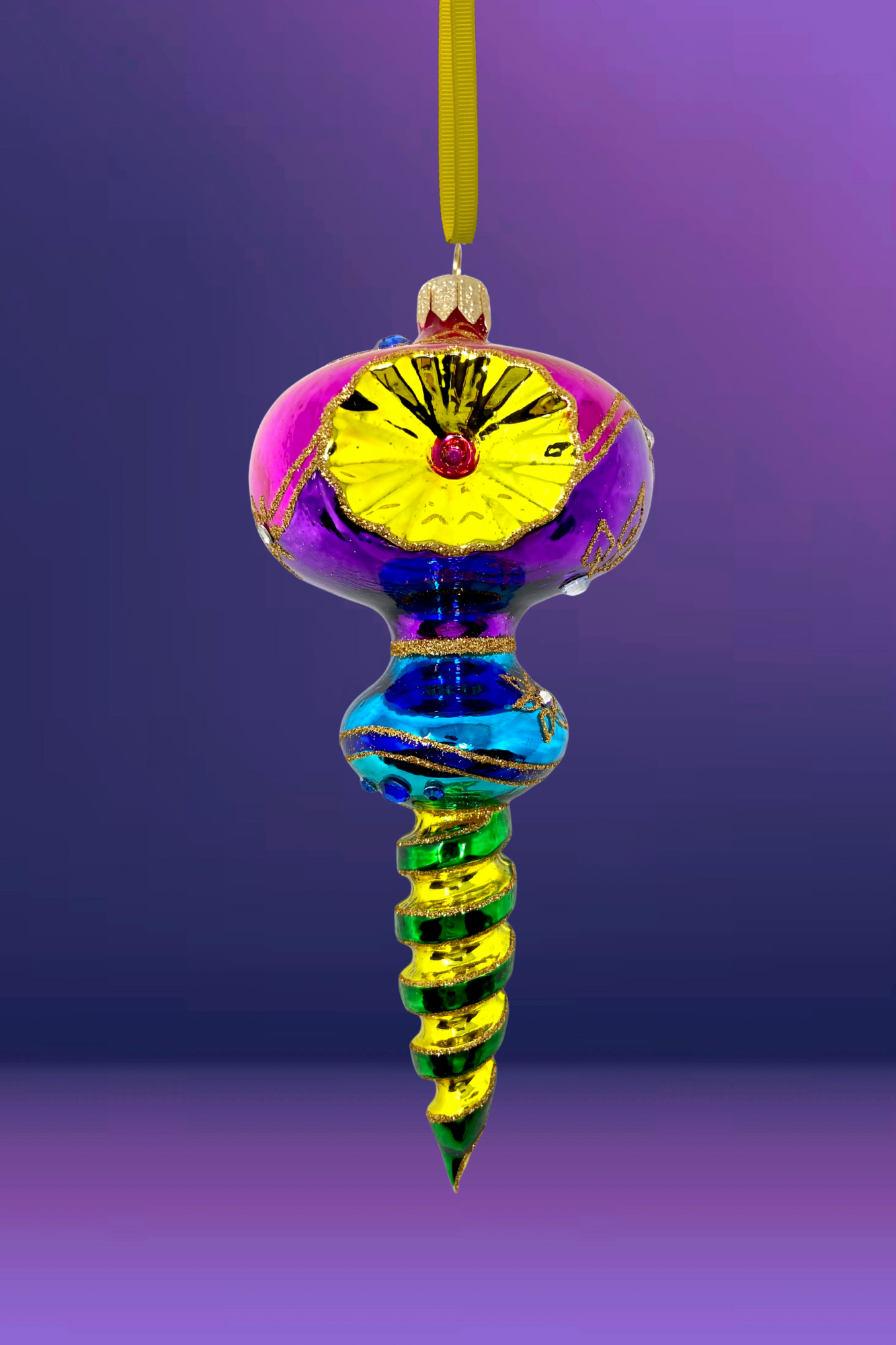 A treasure from a world of midnight markets and swirling silks, this ornament glows in sapphire, magenta, and gold with a sunburst reflector and jewel-like coils. It’s a story waiting to be hung.
